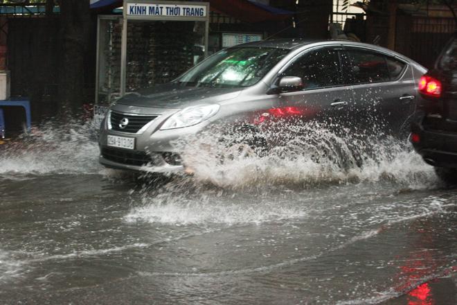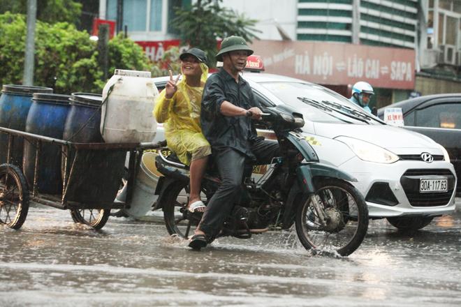 Cơn mưa khiến nhiều tuyến đường ngập nhẹ, nhưng người dân vẫn vui vẻ rẽ nước về nhà.