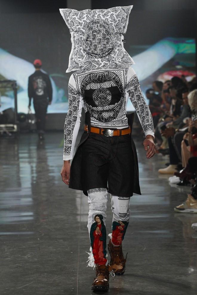 Trong khi đó, nhà thiết kế gốc Mexico, Barbara Sanchez-Kane mang đến bộ sưu tập huyền bí. Các mẫu nam đeo mặt nạ kín bưng trên sàn diễn.