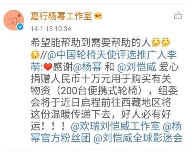 Cụ thể vào 13/1/2014, phòng làm việc của vợ chồng Dương Mịch có đồng ý quyên góp số tiền 100.000 NDT (hơn 350 triệu đồng) cho dự án "xe lăn thiên thần" và "gậy chỉ đường" tuy nhiên số tiền hiện tại vẫn chưa được chuyển.