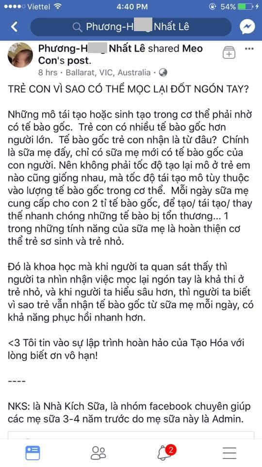 Một trong những quan điểm gây tranh cãi của ''chuyên gia sữa mẹ" Lê Nhất Phương H. là việc sữa mẹ có vô số công dụng, trong đó có cả giúp trẻ... mọc lại đốt ngón tay.