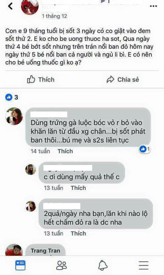 Cũng trong nhóm cộng đồng do Lê Nhất Phương H. thành lập, có những bà mẹ dù con bị sốt co giật và sức khỏe có những biểu hiện bất thường thì vẫn tin tưởng vào tư vấn của cộng đồng mạng thay vì đưa con đi bác sĩ