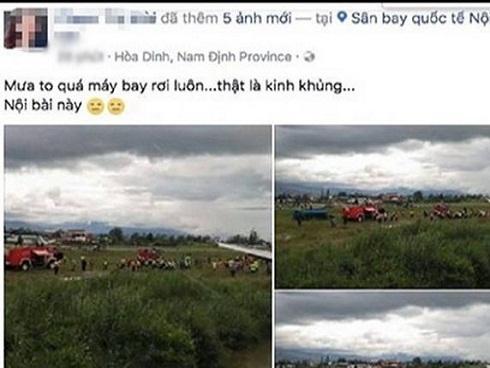 Trước đó, như Dân Việt đã đưa, ngày 20.7, một tài khoản Facebook đã đăng 5 ảnh chụp tại một cuộc diễn tập khẩn nguy hàng không với status "Mưa to quá máy bay rơi luôn... Thật là kinh khủng... Nội Bài này". Trong ảnh có chiếc máy bay mô hình nằm ngang qua mương nước cùng với xe chữa cháy và hoạt động cứu nạn. Thông tin này nhanh chóng được chia sẻ trên cộng đồng mạng.