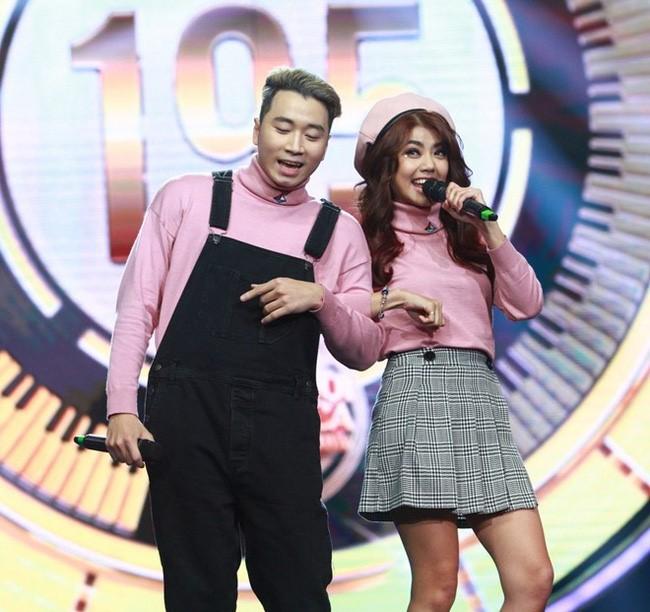 Karik - Phương Linh tình tứ trên truyền hình. Đôi trẻ cùng diện đồ hồng, phối hợp ăn ý.