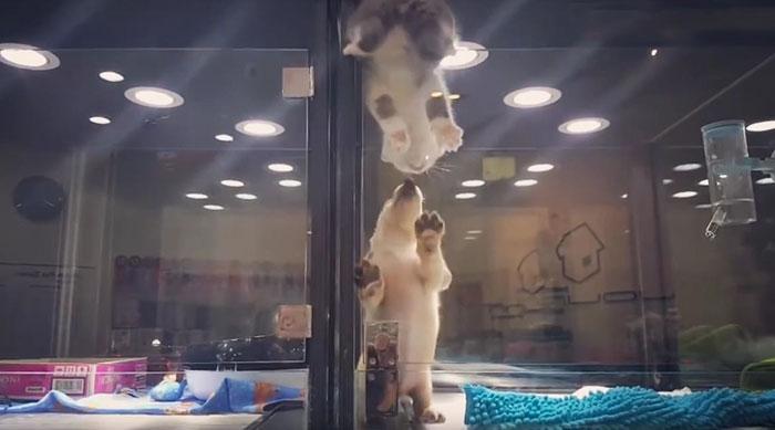 Hẳn là chú mèo con này không thể nào xa rời bạn mình một giây phút nào được, nên đã cố trèo qua bức tường kính "trái ngang" ngăn cách chú với bạn cún.