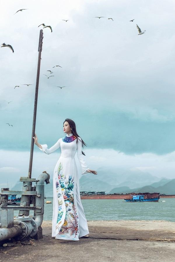 Trang phục sử dụng 2 tông màu chủ đạo là trắng và xanh, lấy cảm hứng từ đại dương xanh ngát kết hợp vào đó là những con sóng trắng ngần có lúc thật mạnh mẽ và kì vĩ, có lúc lại khá dịu dàng êm ái. Hình ảnh đó giống như tính cách của người phụ nữa Việt Nam vừa thuần khiết, dịu dàng, đôi lúc lại rất mạnh mẻ, kiên cường.