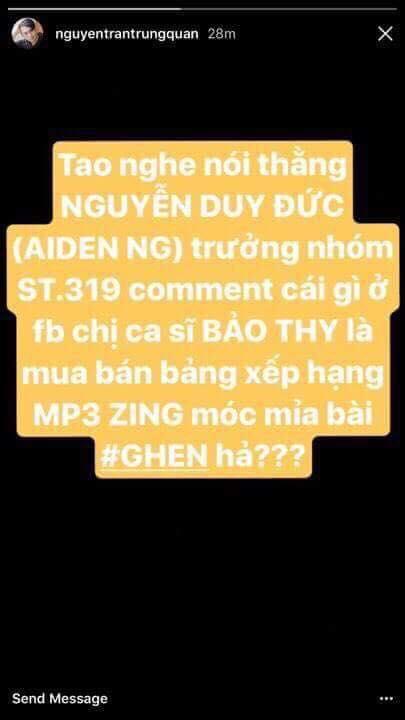 Aiden cũng đã block Facebook Quân từ rất lâu. Nếu không Quân đã tag thẳng tên Aiden trên Facebook. Quân nghĩ có những cái cũng cần phải có động thái, không thì nhiều khi người ta cứ nghĩ người ta đúng, phát ngôn bừa bãi ảnh hưởng tới cả tập thể chứ không chỉ riêng Quân" - Nguyễn Trần Trung Quân bày tỏ.