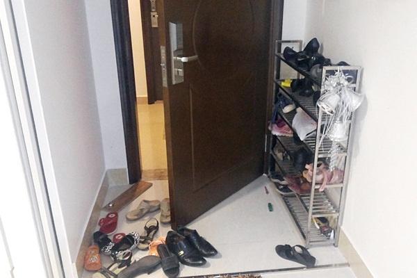 Khu vực cửa chính lộn xộn và thiếu ánh sáng