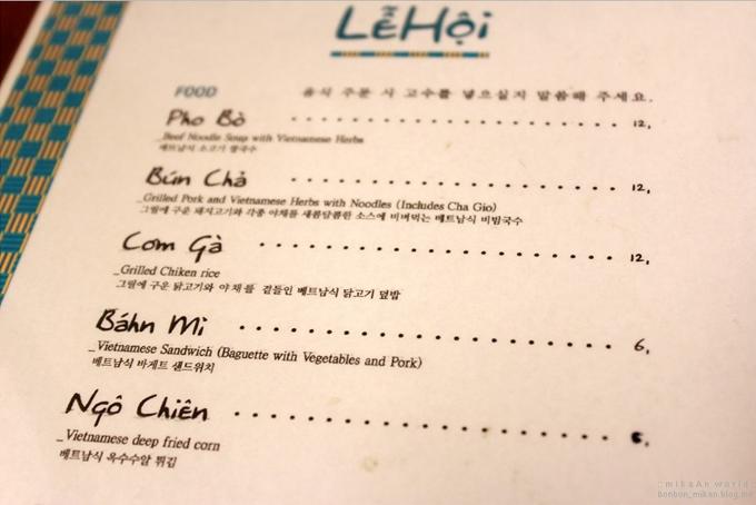 Thực đơn có ghi cả 3 thứ tiếng là Việt, Anh và Hàn, đi kèm diễn tả thành phần để thực khách dễ bề gọi món. Giá cả khoảng 6.000 - 12.000 won (khoảng 130.000 đồng đến 260.000 đồng) một món, mức giá khá phải chăng ở Seoul. Ngoài đồ ăn, các loại đồ uống cũng giống hệt ở các quán ăn Việt như các loại bia nội địa, rượu nếp mới...