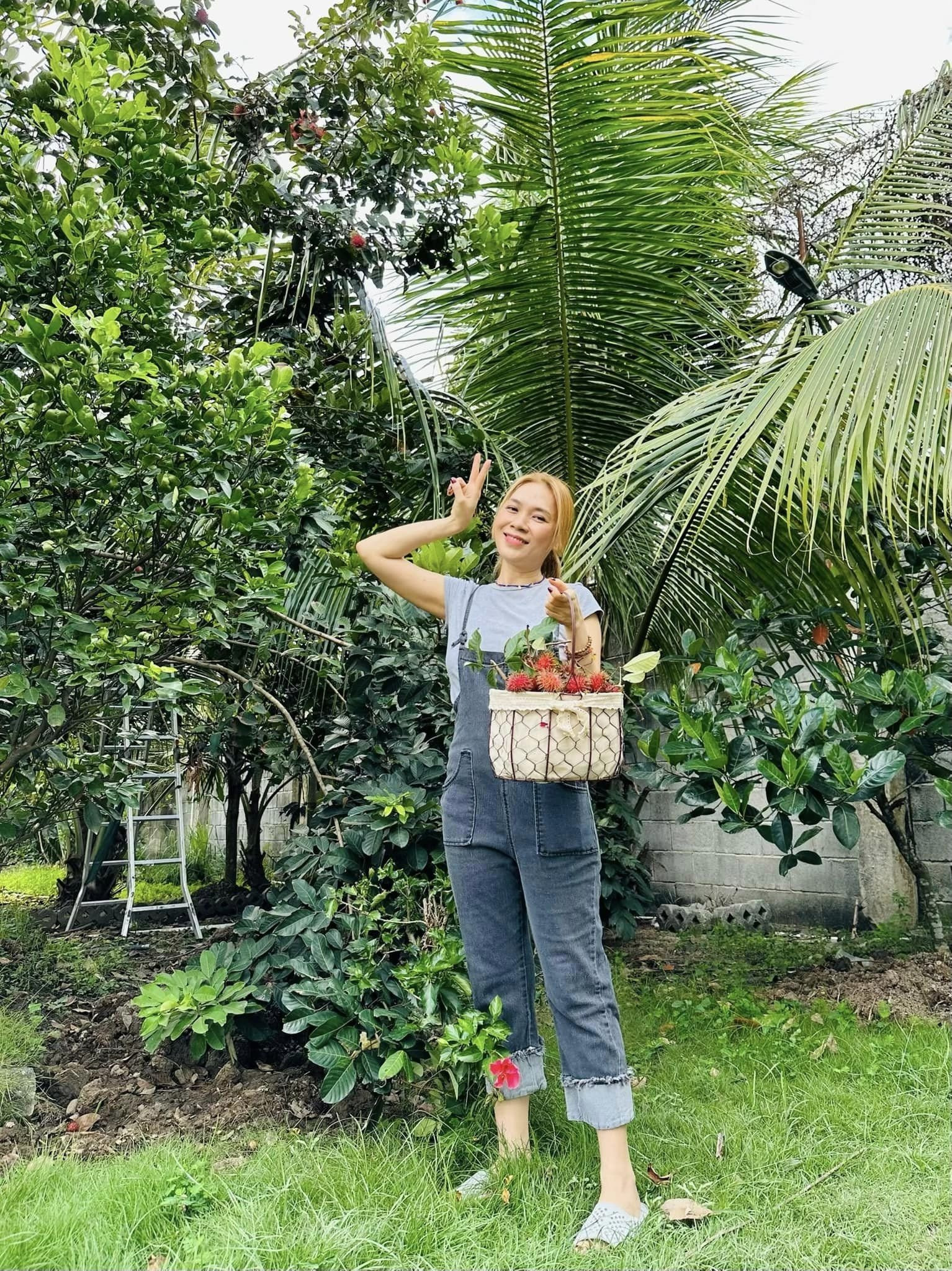 Mỹ Tâm trồng nhiều loại hoa, hoa màu và cây ăn quả như hoa giấy, hoa mười giờ, dưa leo, ớt, ngô, ổi, táo, bưởi, chôm chôm...