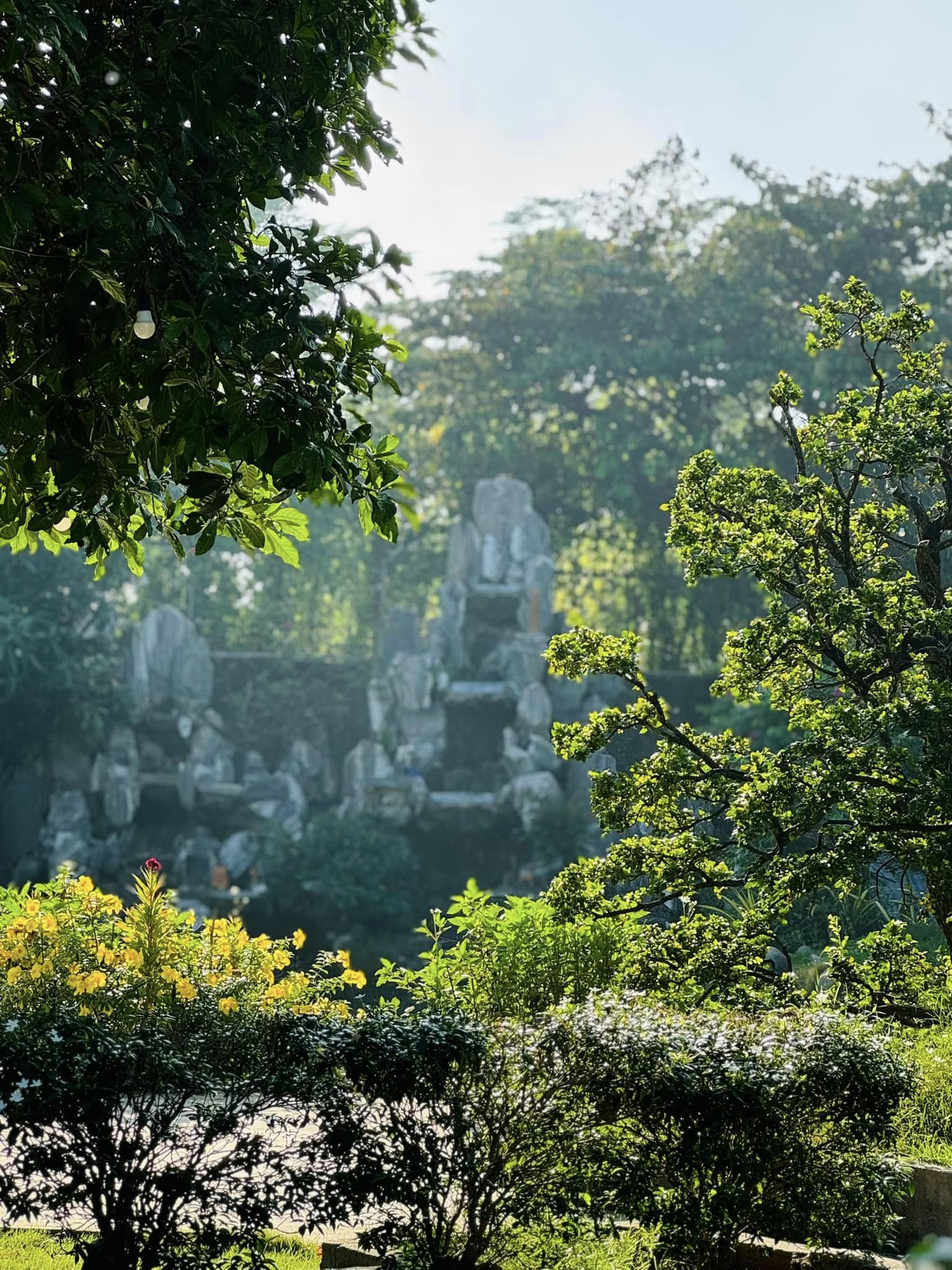 Một góc vườn, cô đặt bàn làm nơi ăn, thưởng trà, rượu hoặc mở tiệc cùng gia đình, người thân và bạn bè ngoài trời. Góc này được giăng dây đèn lung linh, phía sau treo tranh tròn tráng gương điện tích hợp đèn LED, có hòn non bộ và một hồ nước lớn.