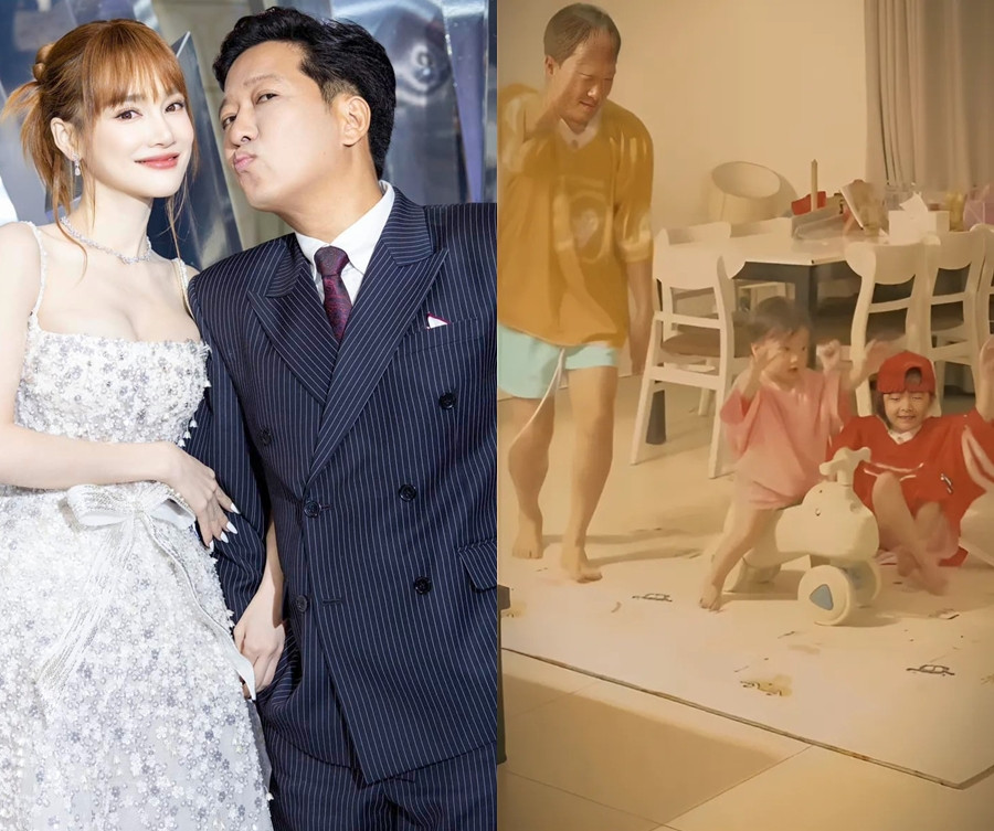 Khác hẳn hình ảnh của MC kì cựu trên các chương trình, khi trở về nhà, Trường Giang nhập vai bố bỉm cực ngọt. Anh xuất hiện với trang phục giản dị gồm quần đùi, áo thun dành thời gian chơi đùa với con cái dù lịch trình công việc dày đặc.