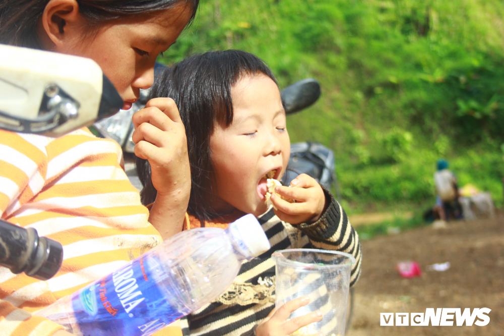 Người dân bản Sáng Tùng ngồi la liệt dọc lối vào bản, cạnh những vật dụng còn sót lại mà họ vừa bới được từ đống đất đá sạt lở, nơi từng là những ngôi nhà của nhiều gia đình. Bữa trưa của những đứa trẻ nơi đây giờ chỉ là mẩu bánh mỳ hay những gói mỳ tôm và vài ba thanh lương khô vừa được cứu trợ.