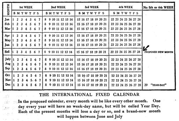 Theo bộ lịch này, tháng nào cũng có chính xác 4 tuần, và ngày đầu tiên của tháng sẽ luôn là thứ Hai, ngày thứ hai thì là thứ Ba và cứ thể tiếp diễn tới những tháng sau. Điều đó đồng nghĩa với việc những dịp đặc biệt, những ngày lễ Tết, những ngày sinh nhật của từng cá nhân sẽ luôn rơi vào một thứ nhất định.