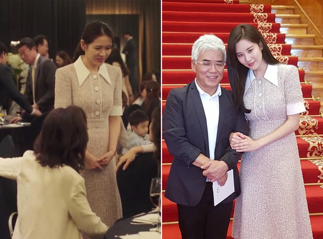 Cùng 1 mẫu váy, nhưng kiểu tóc buộc thấp khiến Son Ye Jin trông khá nhạt nhòa, còn Seohyun lại thiên về sự trẻ trung, thanh lịch.