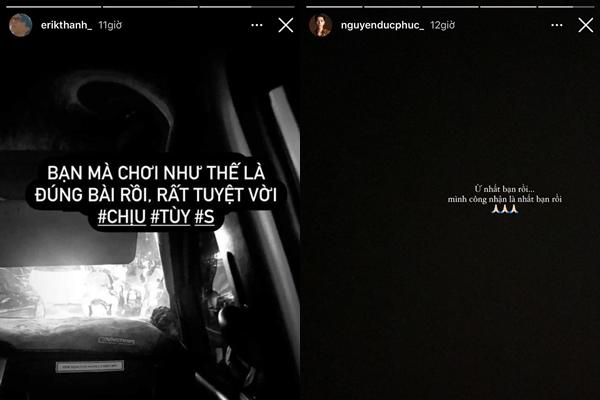 Cụ thể, vào tối 7/12, cùng vào 1 khung giờ, Đức Phúc và Erik đồng loạt đăng story trên Instagram có từ ngữ như "đá xéo" đối phương.