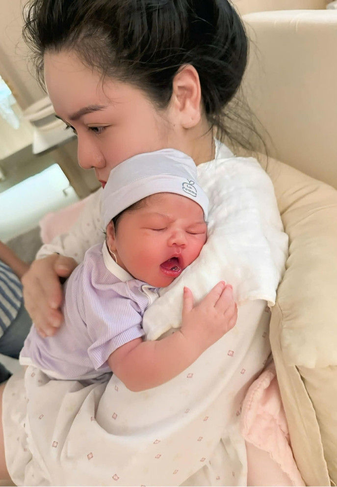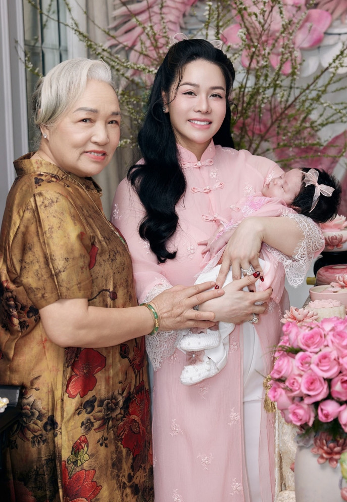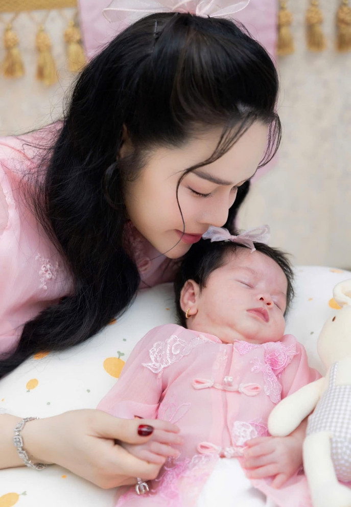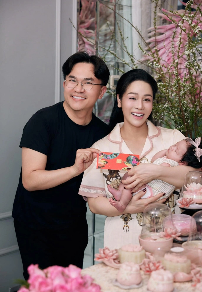 Dịp con đầy tháng, cô tổ chức tiệc hoành tráng tại nhà với hơn 100 khách mời, gồm bạn bè, đồng nghiệp thân thiết như MC Đại Nghĩa, Quách Ngọc Tuyên, đạo diễn Nguyễn Phương Điền… Tiệc với tông hồng chủ đạo, tỉ mỉ trong bày trí. Cô chia sẻ hình ảnh quà tặng giá trị từ khách mời như tiền, vàng, trang sức...