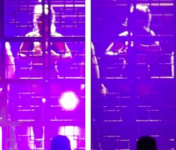 Ngay sau khi phát hiện sự cố, bà mẹ 2 con nhanh chóng lách vào trong và chỉnh trang trang phục rồi tiếp tục biểu diễn.
