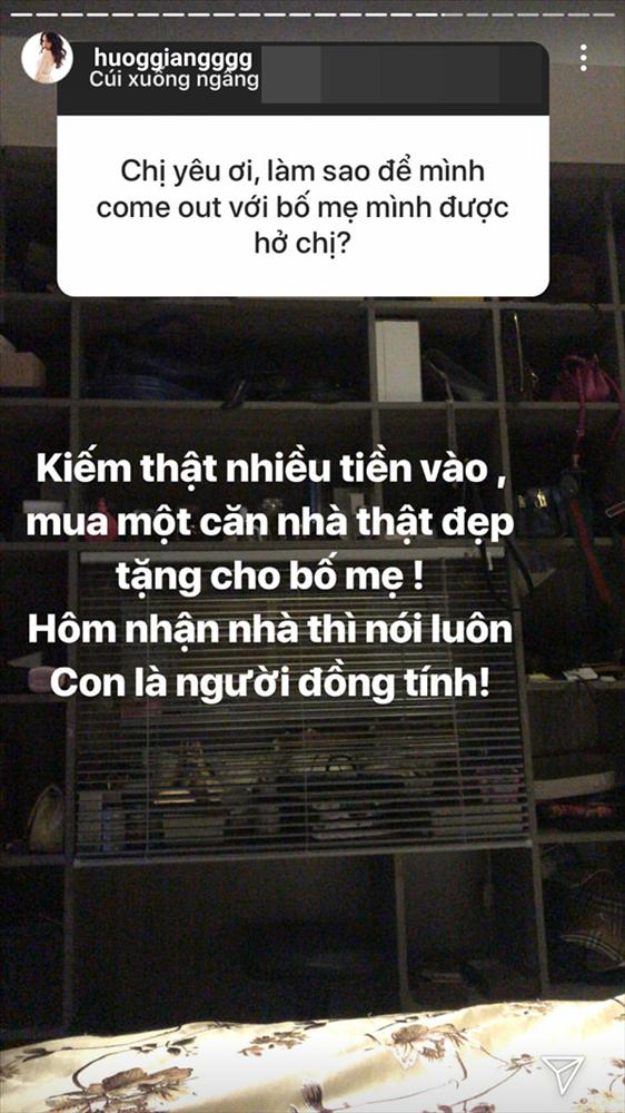 Với câu hỏi làm thế nào để thừa nhận giới tính thật với bố mẹ, Hương Giang đáp: "Kiếm thật nhiều tiền vào, mua một căn nhà thật đẹp tặng cho bố mẹ! Hôm nhận nhà thì nói luôn: Con là người đồng tính!".