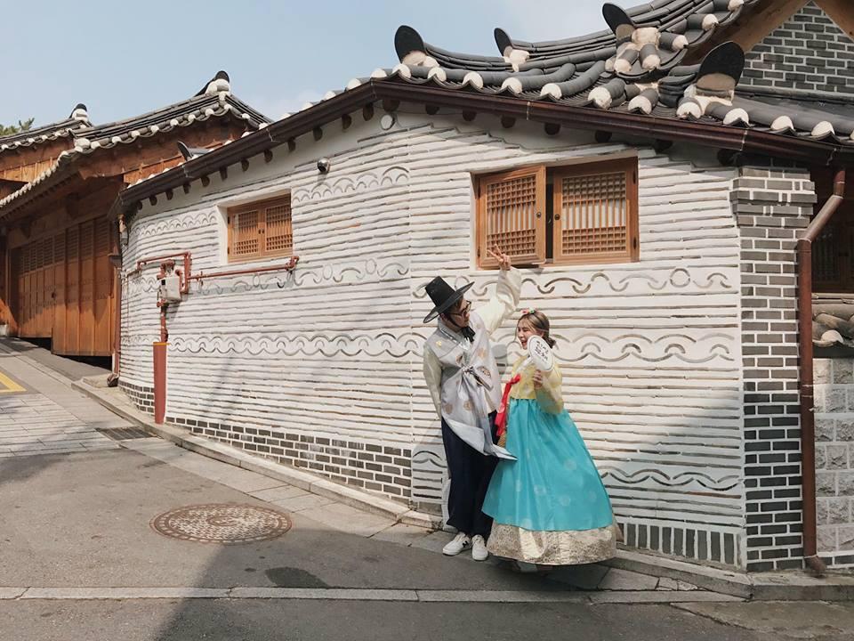 Khoe khoảnh khắc chụp cùng bà xã, Kiên Hoàng nhắn nhủ: "Đợt này bố Cam mải cày 'World Cup', nhìn mẹ Cam thấy tội nghiệp. Bỗng nhớ lại kỉ niệm hè năm ngoái đi Seoul với vợ lại máu xách vali và lên đường. Lại muốn ăn kem cá, rồi ăn gà rán bên bờ sông Hàn, qua làng cổ Bukchon chụp mấy kiểu ảnh với đồ Hanbok".