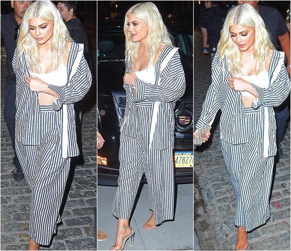 Bộ đồ kẻ sọc lấp ló chiếc áo bralet trắng cùng mái tóc bạch kim giúp Kylier thực