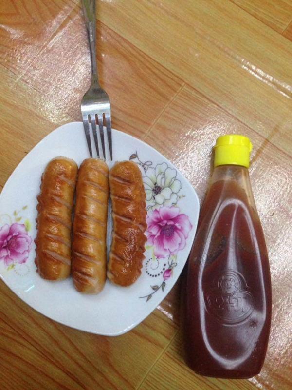 Chủ nhân của bức ảnh, N.V.Thắng viết trên facebook, "Có đứa bạn không biết nấu ăn nên khổ quá. Hôm nay bạn nấu cho món này đây. Nhìn không dám ăn. Không hiểu bạn chiên xúc xích với bột kiểu gì thành ra thế này.