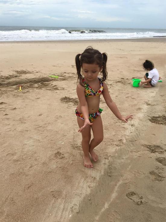 Con gái MC Thành Trung và vợ cũ Thu Phượng diện bộ áo tắm họa tiết nổi bật kết hợp dép xỏ ngón. Style của bé rất sành điệu, hợp mốt cho ngày đi tắm biển.