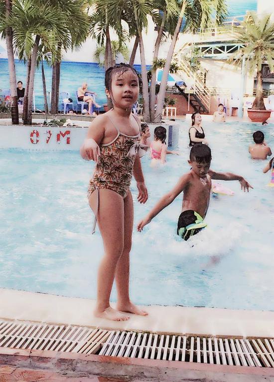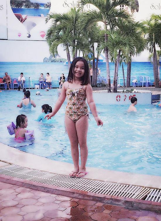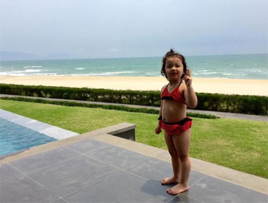 Diva Hồng Nhung sắm cho con gái nhiều bộ bikini độc đáo. Cô bé khiến nhiều người phải ngưỡng mộ về vẻ siêu đáng yêu khi mặc bikini họa tiết đứng tạo dáng.
