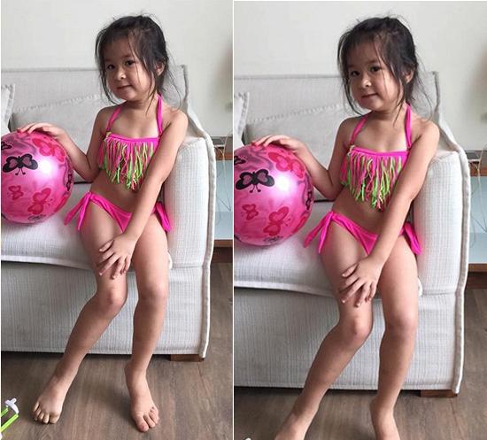 "Công chúa" nhà Huy Khánh và Mạc Anh Thư mặc bộ bikini hồng dễ thương. Cách ngồi tạo dáng của bé chẳng kém gì mẫu nhí.