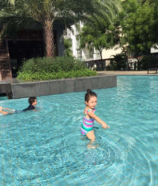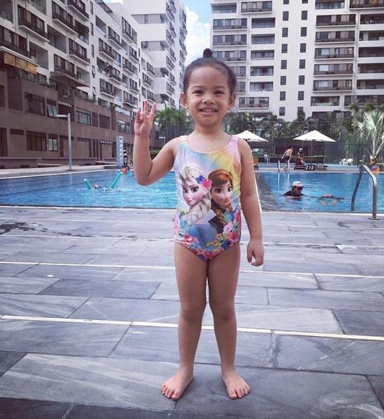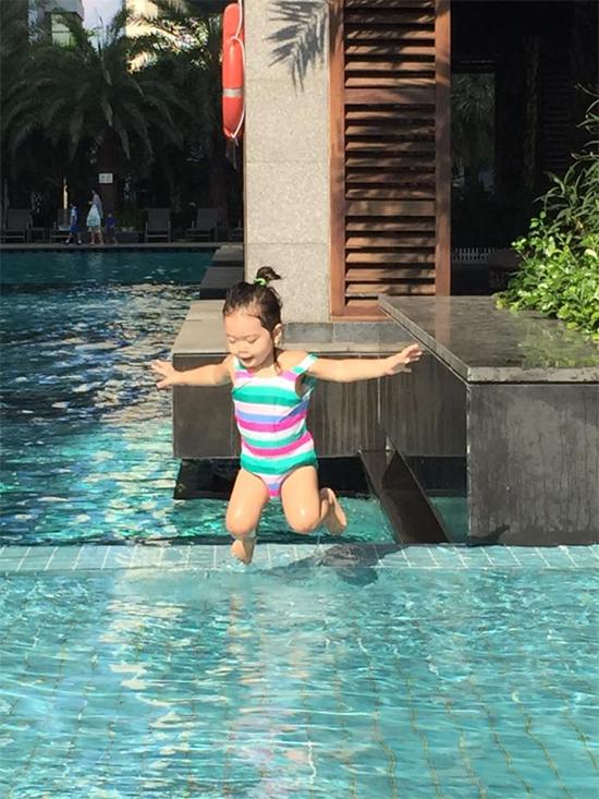 Bé Sol - con gái Đoan Trang thích thú khi được mẹ cho đi hồ bơi. Cô bé mặc bộ áo tắm kẻ sọc bắt mắt và tỏ vẻ rất "điêu luyện".