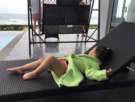 Bé Na còn nằm trên ghế phơi nắng rất ra dáng người lớn.