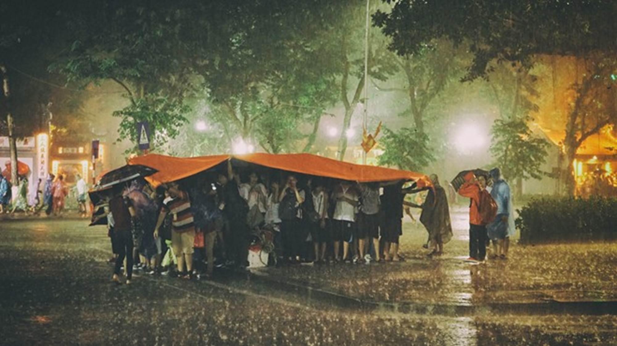 Trong ảnh, các thành viên nhóm MyHanoi dưới cơn mưa lớn trong ngày mở