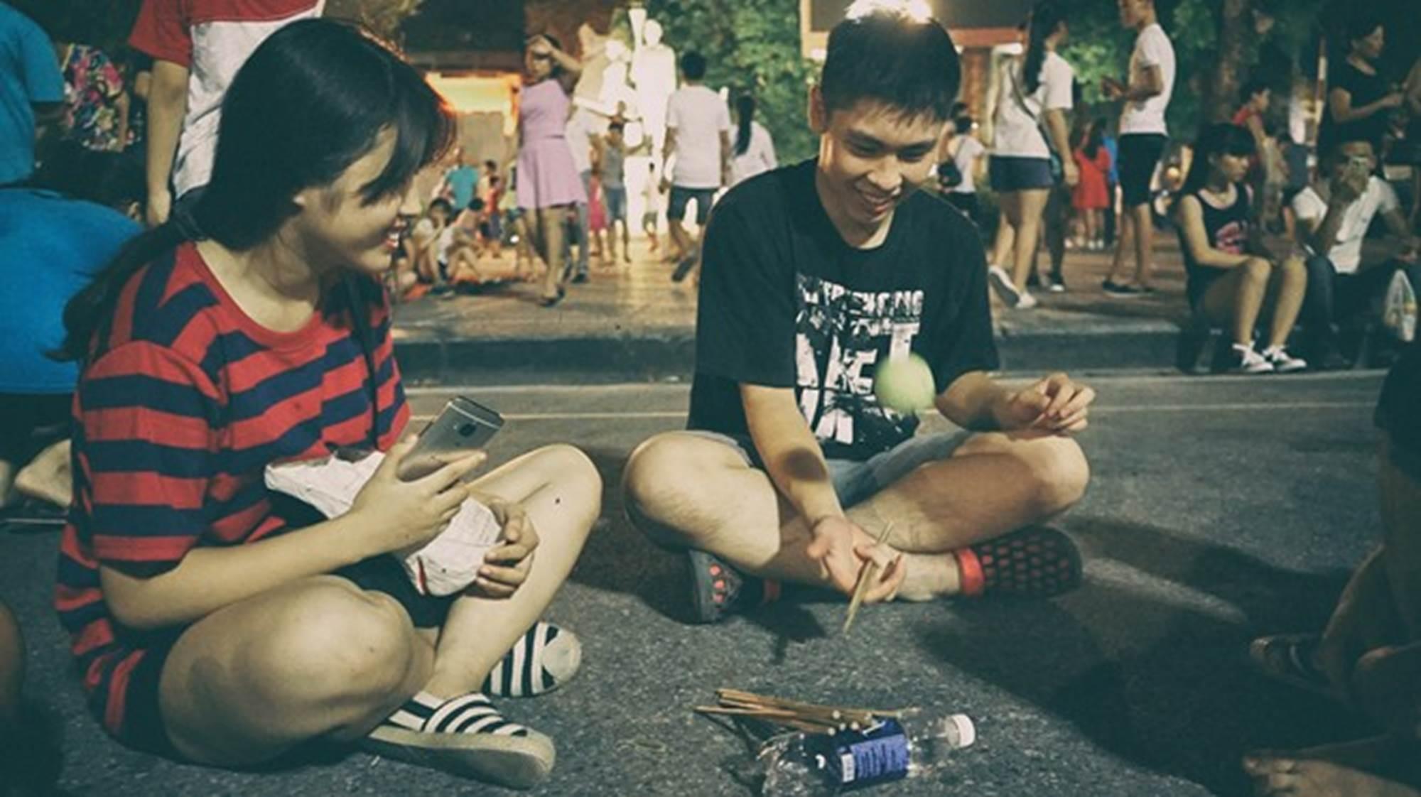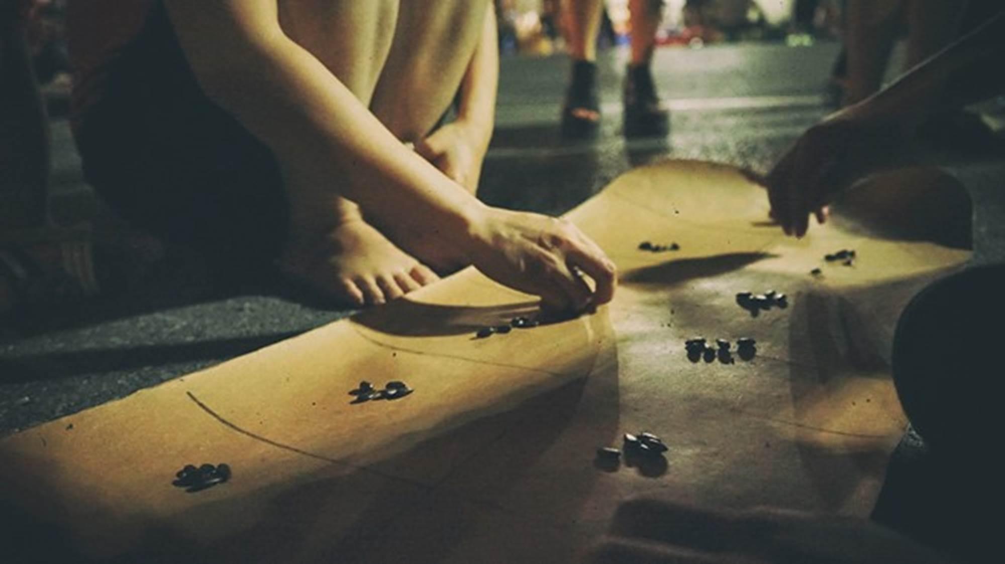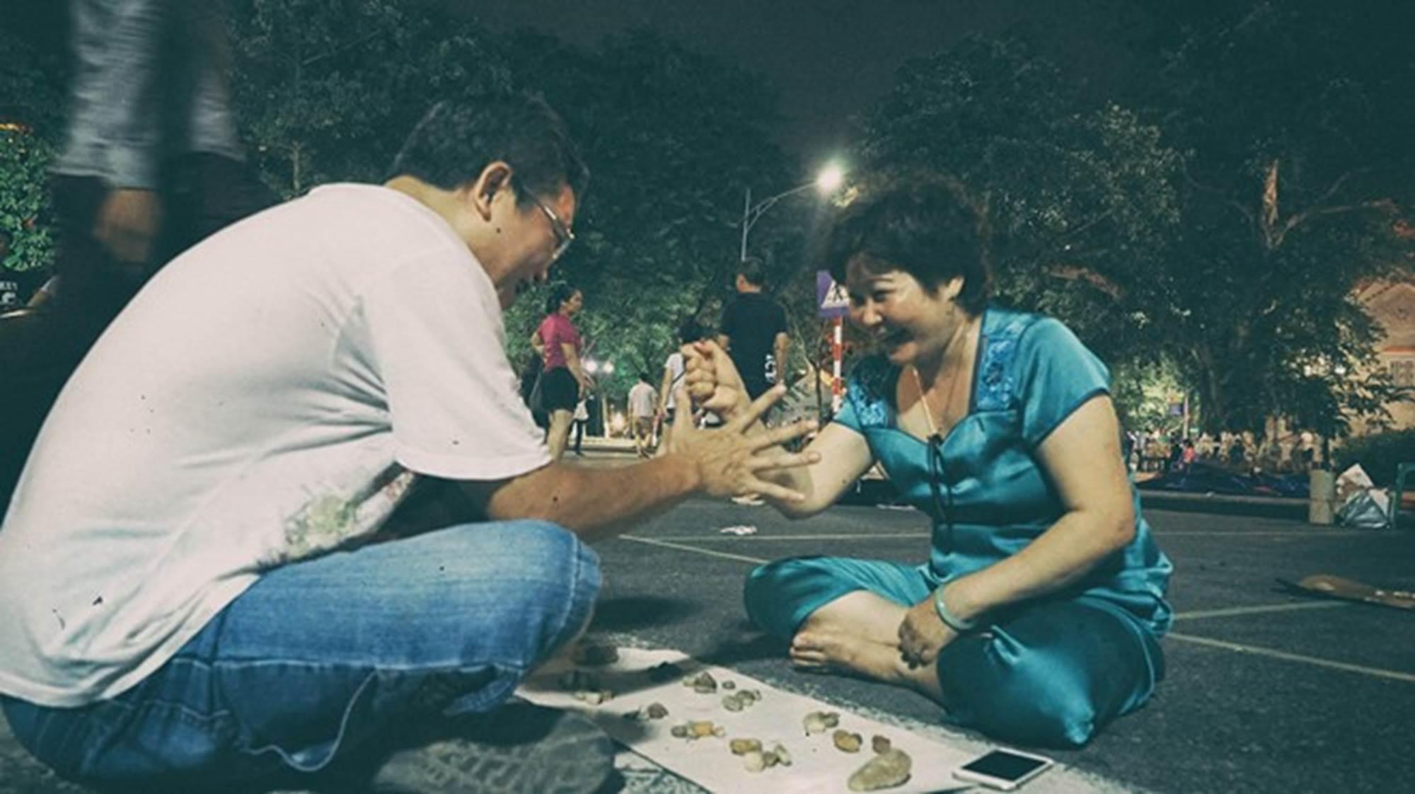 Trò ô ăn quan tại phố đi bộ quanh hồ Gươm được chơi trên bìa cứng và lấy đá