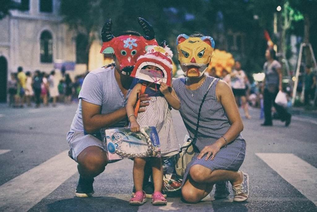 Một gia đình mua những chiếc mặt nạ truyền thống để cùng con vui Trung thu.