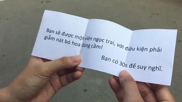 Mới đây một nhóm bạn trẻ tại TP. Hồ Chí Minh đã thực hiện một đoạn clip thử nghiệm tính “thực dụng” của nhiều cô gái. Đoạn clip là một trò chơi nhỏ dành cho các cặp đôi yêu nhau trên phố đi bộ Nguyễn Huệ, nhóm đã thử những cô gái bằng cách lựa chọn món quà mà mình muốn. Trong đó, hoa ( đại diện cho tình cảm) và ngọc ( đại diện cho vật chất)