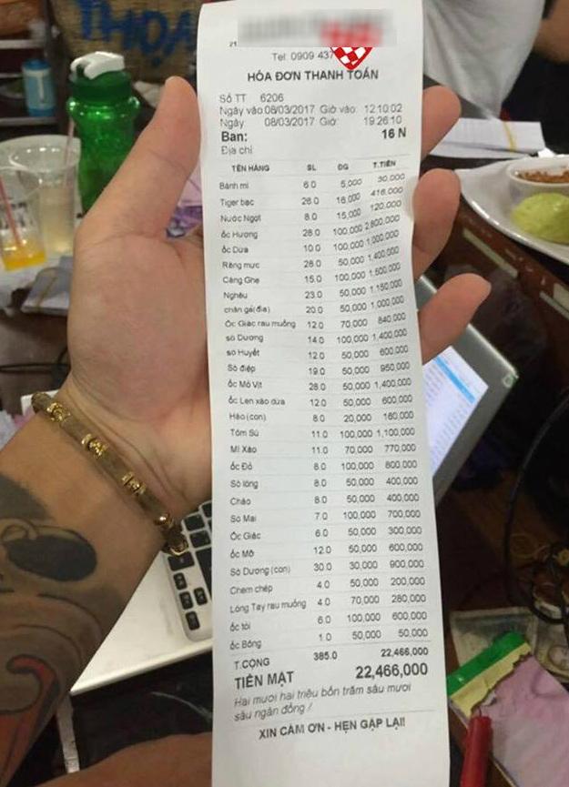 Cụ thể, vị khách này ăn ốc vào ngày 8/3. Giờ vào cửa hàng là 12 giờ trưa nhưng đến hơn 7 giờ tối mới ra khỏi quán ốc. Nhóm thực khách đã gọi rất nhiều loại ốc, sò từ giá bình dân đến đắt đỏ như ốc giác, nghêu, càng ghẹ, ốc hương, ốc mỡ, chem chép, móng tay... kèm theo đó là 28 chai bia, 8 chai nước ngọt, 6 ổ bánh mì. Giá trung bình mỗi đĩa ốc dao động từ 50 đến 100.000 đồng!