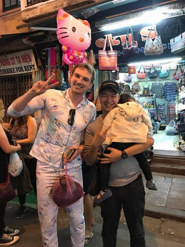 Trước đó, tại phố đi bộ Hà Nội, xuất hiện hai chàng Tây diện váy ngủ hình Hello Kitty dạo phố.