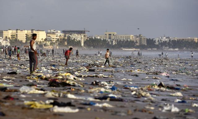 Bãi biển Juhu, Mumbai, Ấn Độ: Một trong những bãi biển đông khách nhất ở Mymbai, Juhu cũng thuộc hàng bẩn nhất. Bãi cát phủ kín rác, chủ yếu là túi nylon. Ngoài ra, nước thải từ các tòa nhà gần đó cũng có thể được đổ ra biển, gây ô nhiễm nặng nề hơn. Ảnh: Hindustan Times.