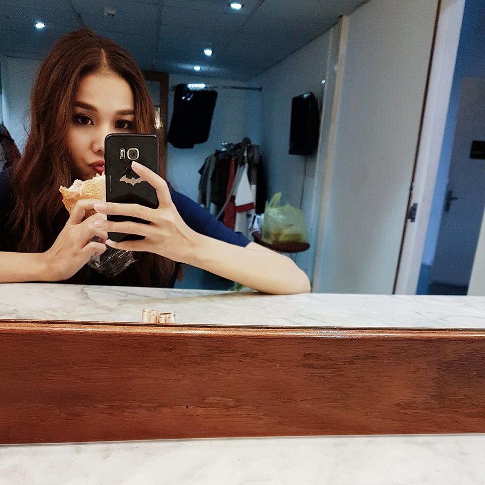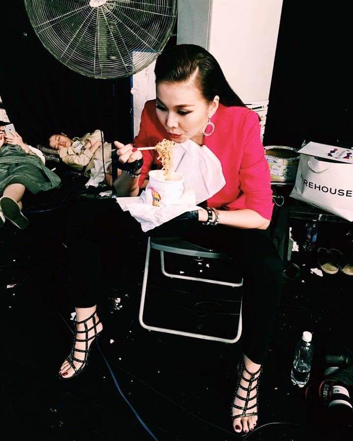 Để kịp giờ làm việc, Thanh Hằng không ít lần phải biến hậu trường thành phòng ăn trong chớp nhoáng. Bữa ăn tạm bợ với mì gói, cơm hộp, bánh mỳ... trở thành "cứu cánh" cho người đẹp trong những lúc tham công tiếc việc.