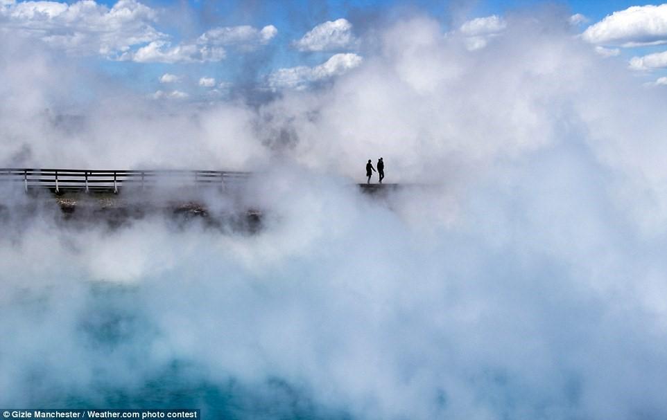 Gizle Manchester chụp ảnh một gia đình đi qua suối nước nóng Midway Geyser ở công viên quốc gia Yellowstone, Mỹ.