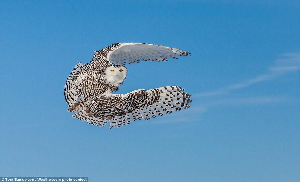 Con cú tuyết tung cánh bay trong ảnh của Tom Samuelson.