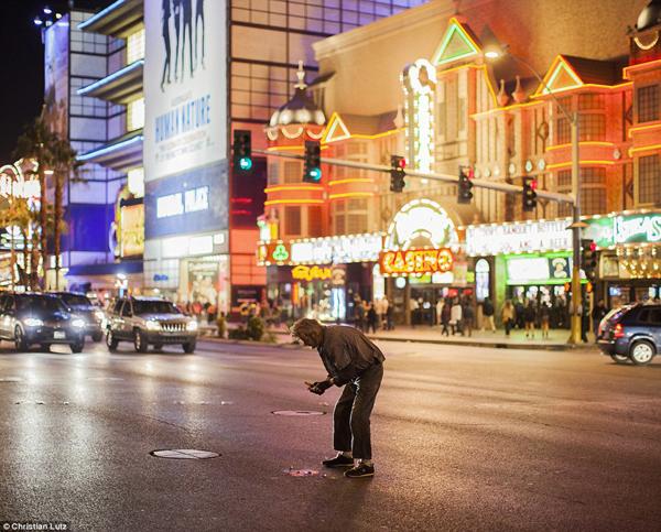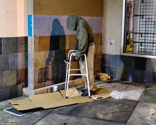 "Cảm xúc của tôi đã đạt đến đỉnh cao khi nhìn thấy cảnh tượng này. Tôi phải chụp lại khoảnh khắc ấy", Lutz nói. Hình ảnh một người vô gia cư đứng giữa đường đầy ám ảnh.
