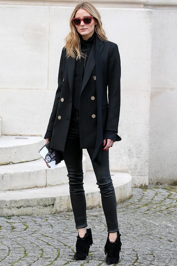 Kết hợp một chiếc quần jeans đen với áo sơ mi kiểu cách cùng áo khoác blazer đen có cúc kim loại và một đôi boot hở mắt cá chân sẽ giúp bạn đẹp hoàn hảo vì đây là gam màu đơn giản nhưng vẫn cực kì nổi bật.