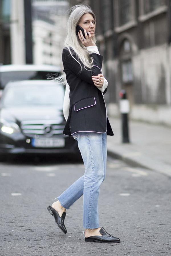 Liệu bạn có đang tìm kiếm một bộ cánh đi làm với phong cách thoải mái hoặc đơn giản muốn tìm cho mình những bộ quần áo vừa có thể diện đến văn phòng và diện vào cuối tuần. Set đồ gồm quần jeans ống thẳng với một áo len trắng, khoác thêm áo khoác blazer và đôi giày đế mỏng là sự lựa chọn tuyệt vời phù hợp để đi làm cũng như phải ra ngoài nếu có cuộc hẹn sau giờ làm.