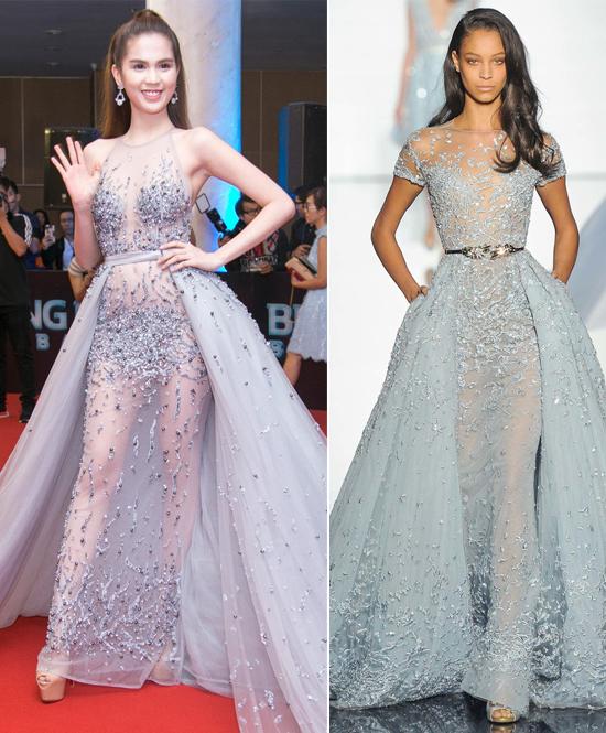 Xuất hiện trên thảm đỏ hội tụ toàn chân dài, Ngọc Trinh khoe sắc trong mẫu đầm dạ hội lấp lánh chất liệu xuyên thấu. Trang phục bị giới mộ điệu phát hiện mang nhiều nét tương đồng với thiết kế thuộc bộ sưu tập Haute Couture xuân hè 2015 của Zuhair Murad.