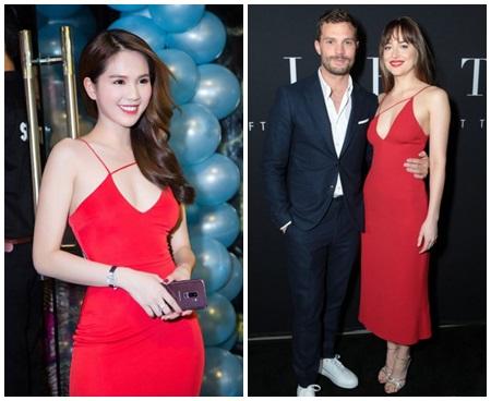 Tham dự sự kiện hồi tháng 3 mới đây, "nữ hoàng nội y" Ngọc Trinh trở thành tâm điểm thu hút ống kính bởi vẻ đẹp nổi bật trong mẫu váy body màu đỏ cổ khoét sâu. Tuy nhiên, nhiều người nhận ra thiết kế đầm của Ngọc Trinh giống với bộ cánh mà nữ diễn viên phim "50 sắc thái" - Dakota Johnson diện trước đó. Được biết thiết kế này thuộc thương hiệu Cushnie et Ochs có giá khoảng 30 triệu đồng. Đây cũng pha mặc váy nhái mở màn năm 2018 của Ngọc Trinh.