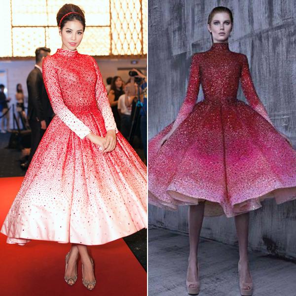 Xuất hiện đêm Chung kết Hoa hậu Đại Dương Việt Nam 2017 diễn ra vào ngày 28/10/2017, chiếc đầm dựng phom tay bồng của "nữ hoàng giải trí" bị giới mộ điệu sành sỏi nhận ra có nhiều điểm tương đồng với sáng tạo từ nhà mốt Stephane Rolland.