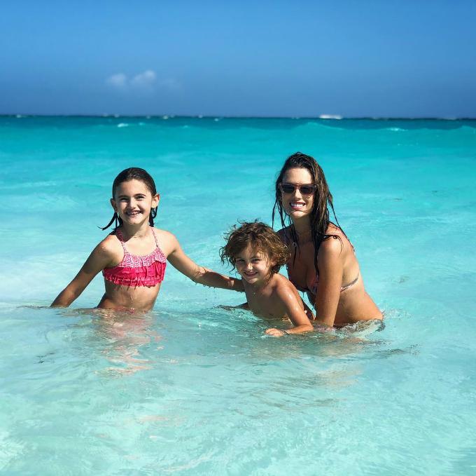 Con trai 5 tuổi dành nụ hôn ngọt ngào cho mẹ trên bờ biển Bahamas - một trong những điểm đến yêu thích của cả gia đình. Bahamas nổi danh với những bãi biển nước xanh ngọc bích đẹp như thiên đường. Alessandra rất yêu biển nên cô thường chọn các bãi tắm cát vàng để cùng các con vui chơi, tắm biển. Cô cho biết: "Một kỳ nghỉ hoàn hảo với tôi phải có nắng vàng và biển xanh, tôi yêu những bộ bikini".