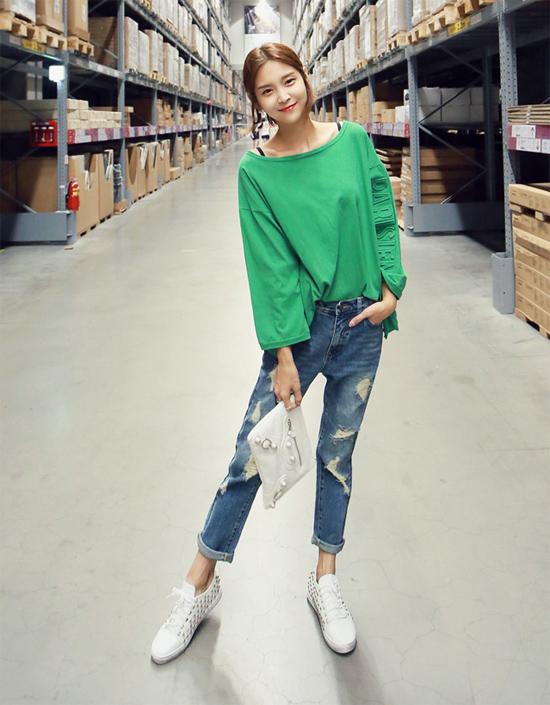 Chiếc quần jeans rách không chỉ có mặt trên đường phố mà ngay cả khi đi làm, bạn trẻ đều có thể diện style cá tính, hơi hướng bụi bặm này. Bạn chỉ cần kết hợp quần jeans rách với một chiếc áo phông màu xanh dáng suông, dài tay cũng đủ làm mình cuốn hút, ấn tượng riêng biệt rồi đấy. Thêm một đôi giày sneaker, clutch trắng càng hoàn thiện thêm vẻ ngoài thời thượng.