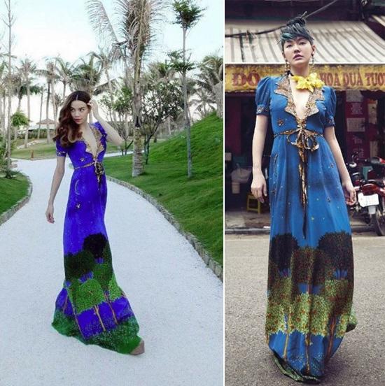 Mới đây, Hà Hồ "đụng hàng" chiếc váy dài thướt tha gam màu xanh mát mắt với
