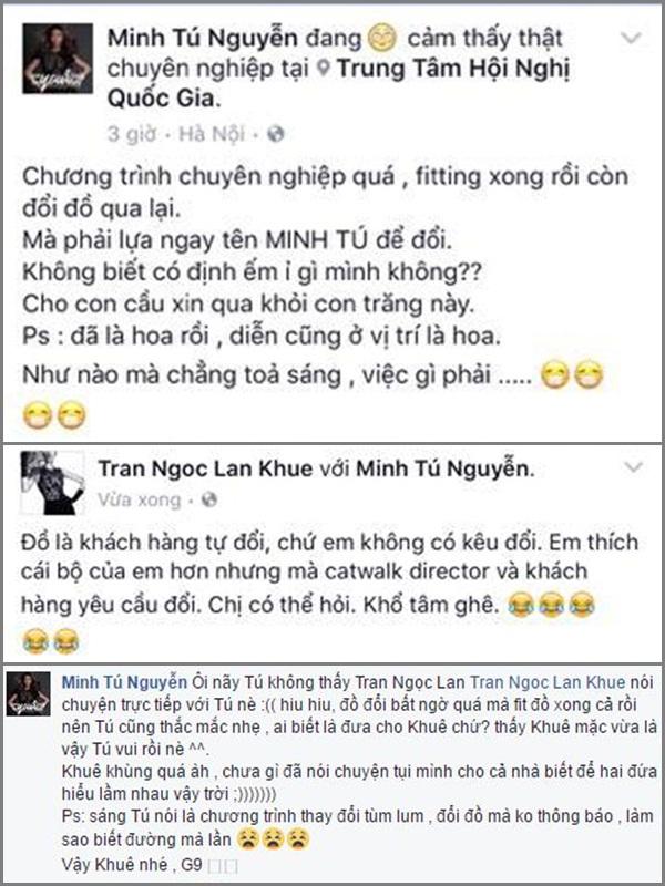 Nhận thấy Minh Tú có hiểu lầm nào đó, Lan Khuê viết một status trên trang cá nhân và "tag" thẳng đàn chị: "Đồ là khách hàng tự đổi, chứ em không có kêu đổi. Em thích cái bộ cái bộ của em hơn nhưng đạo diên catwalk và khách hàng yêu cầu đổi. Chị có thể hỏi, khổ tâm ghê".